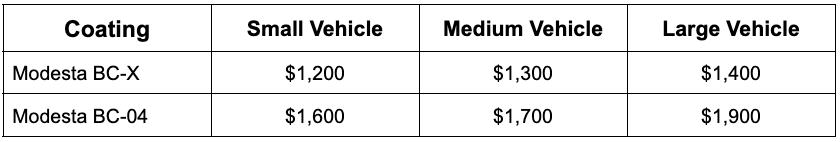Use this chart to get an idea of how much each ceramic coating will cost for your vehicle.